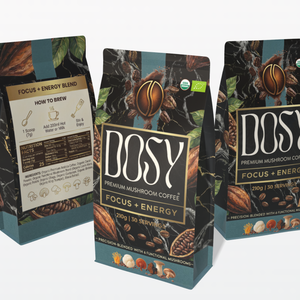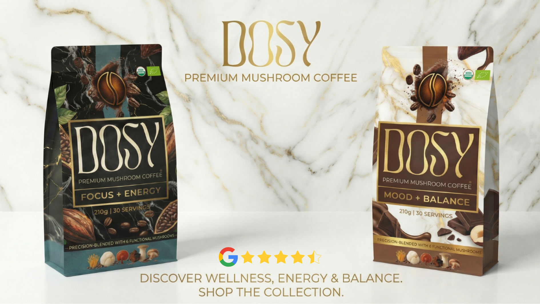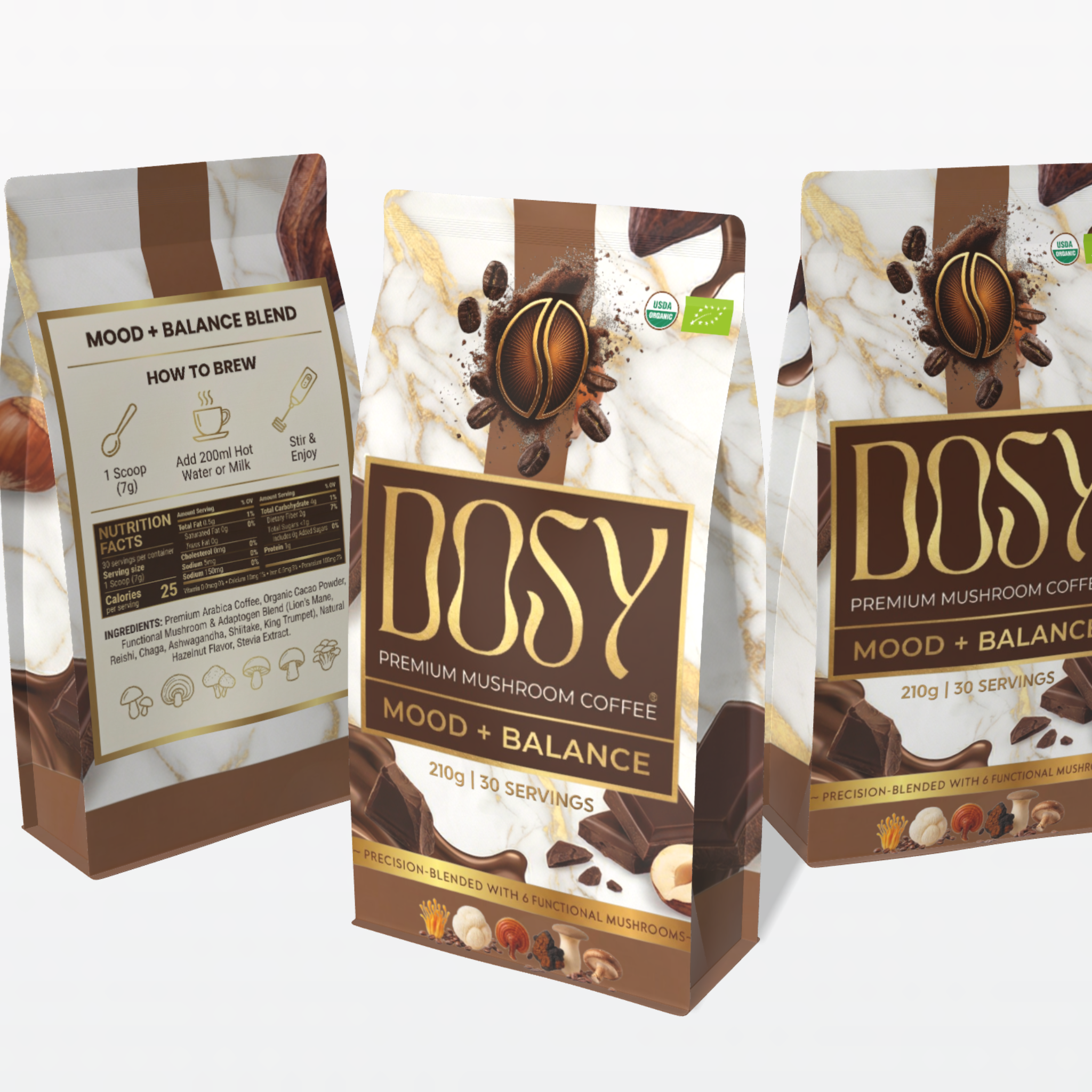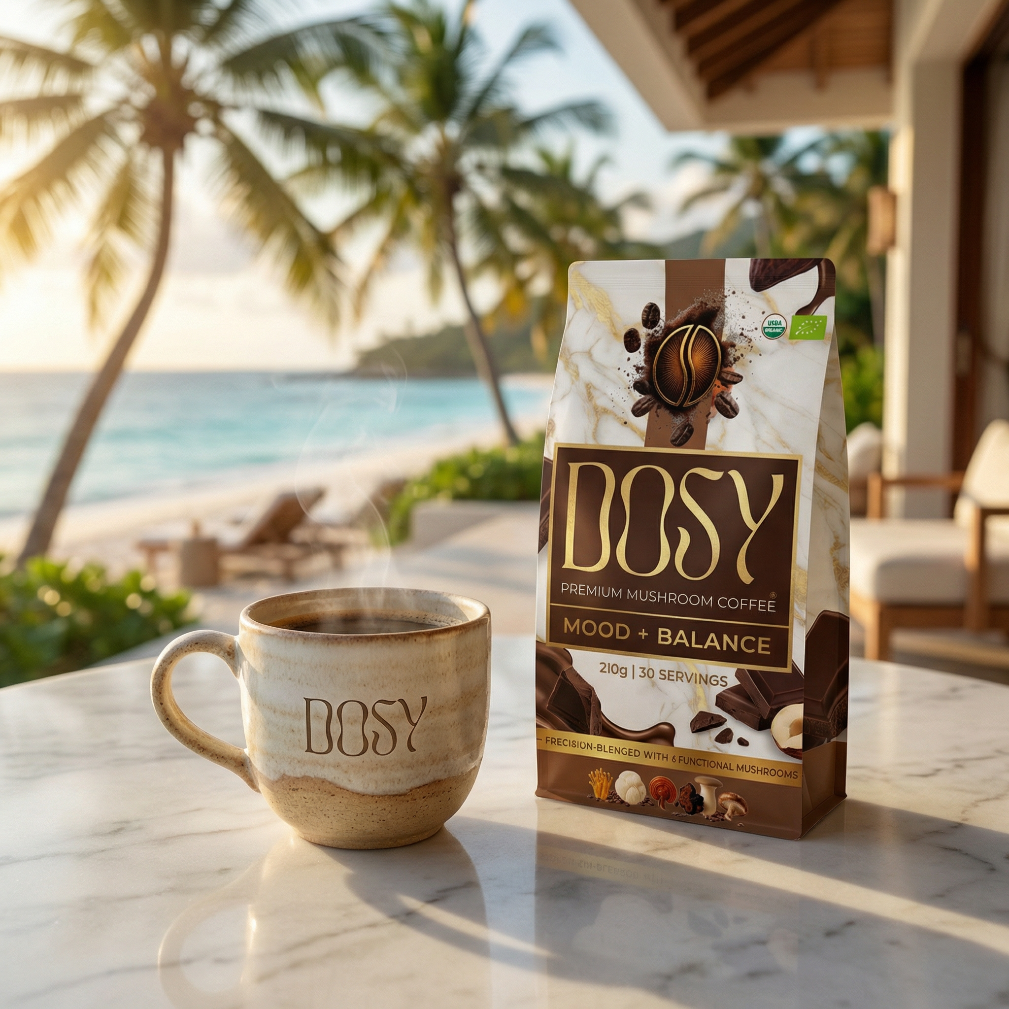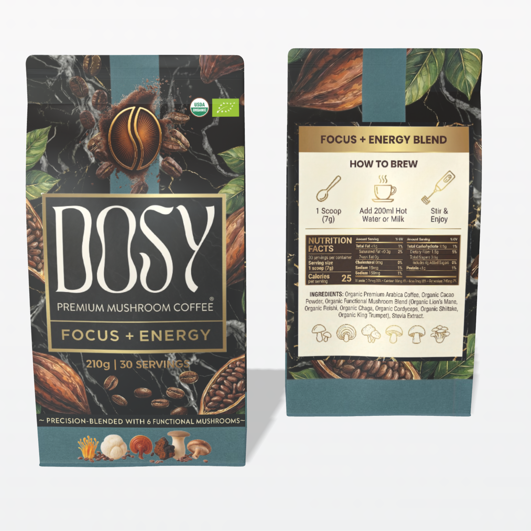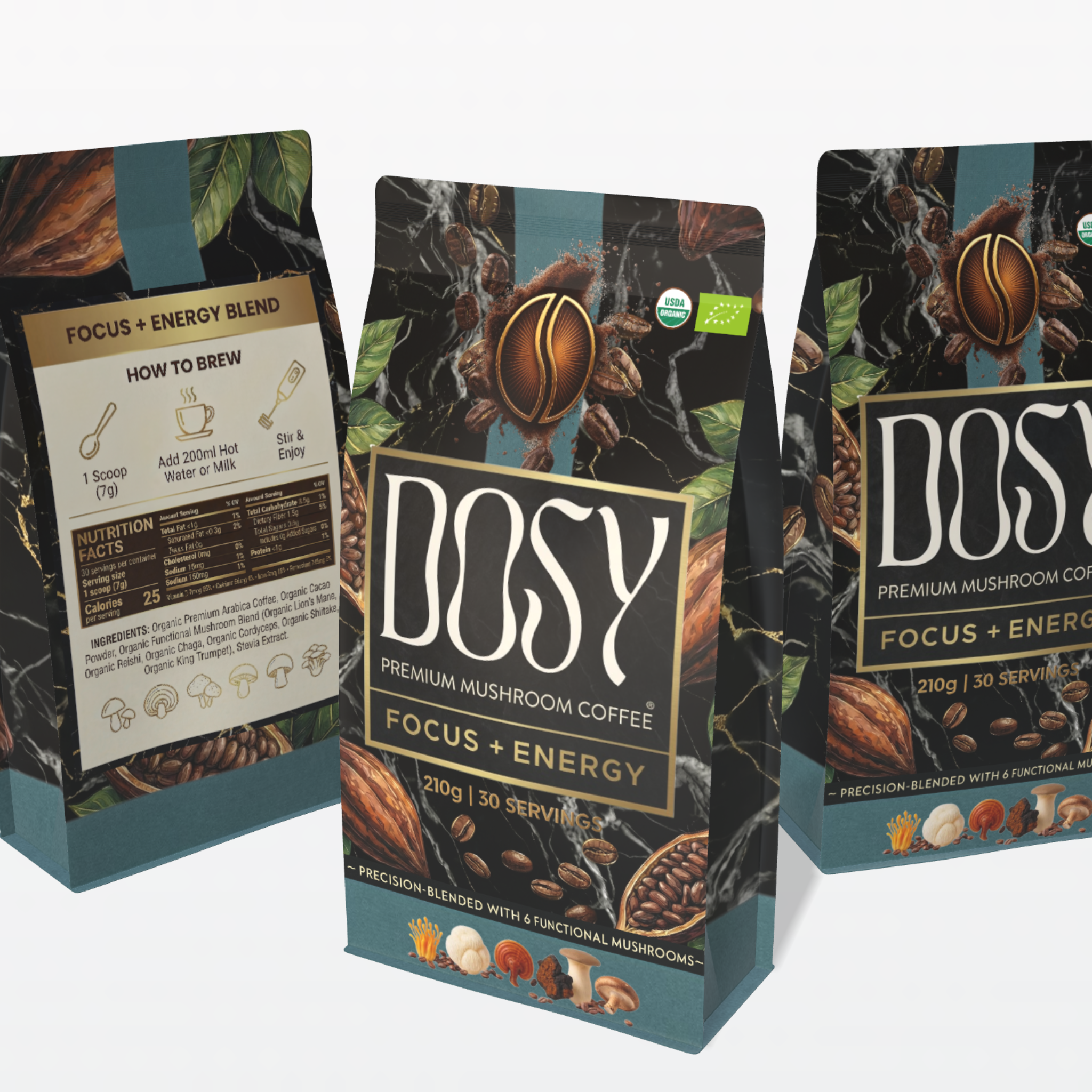 DOSY Premium Mushroom Coffee blends medium-dark roast specialty coffee with functional mushroom extracts to support focus, clarity, and balanced energy — without the crash.